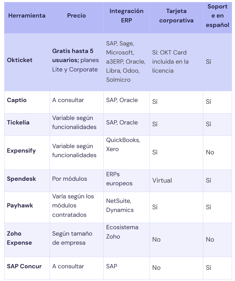 Lo que sí muestra es que Okticket es la única plataforma que combina homologación AEAT, integración nativa con los principales ERP del mercado español, tarjeta corporativa incluida en la licencia y soporte en castellano. Para una empresa española, esa combinación es la diferencia entre una herramienta que encaja y una que requiere adaptaciones constantes.